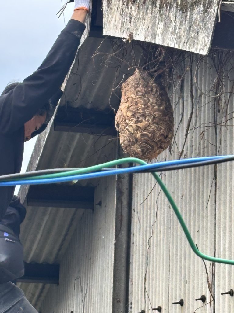 作業前に屋根まで伸びた葛を撤去してる際、足長バチ?スズメバチ?の巣を発見!( ゚Д゚)