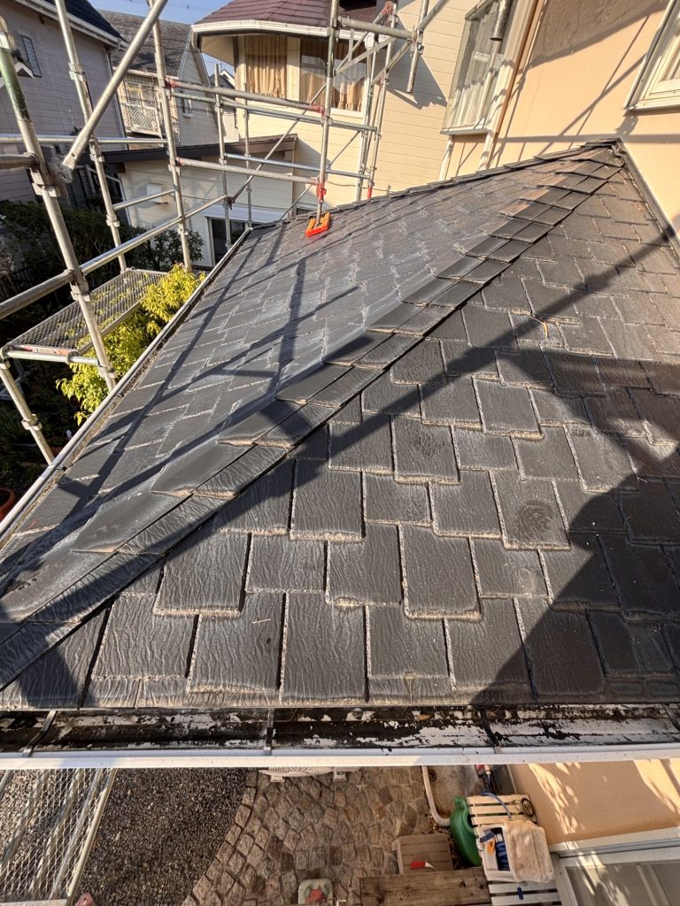 屋根塗装! 2025年11月27日 最終更新日時 : 2025年11月27日 スタッフ コロニアルの淵が白く劣化してることから今回ご依頼頂きました。 厚みのある塗膜で仕上げていきたいと思います 完工迄宜しくお願い致します。