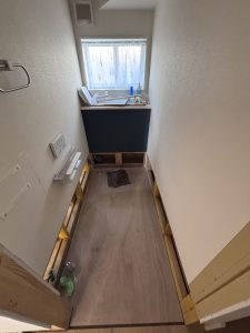 床剥ぎ終えて、コンパネ貼り後に新しくフローリング貼っていきます。