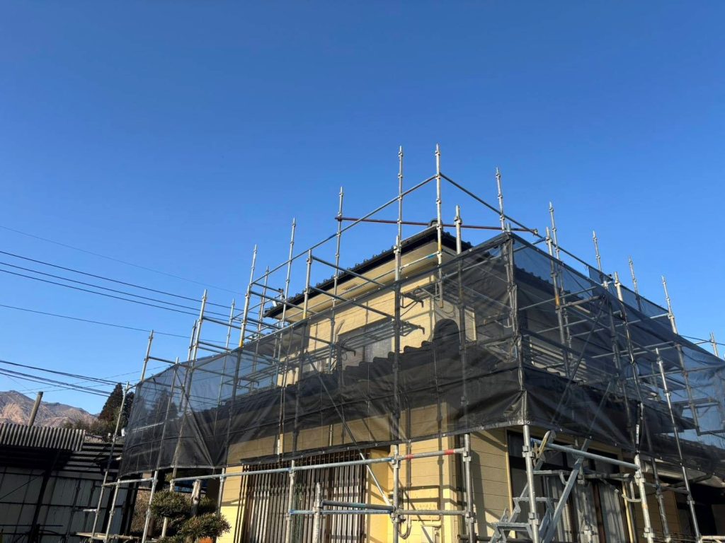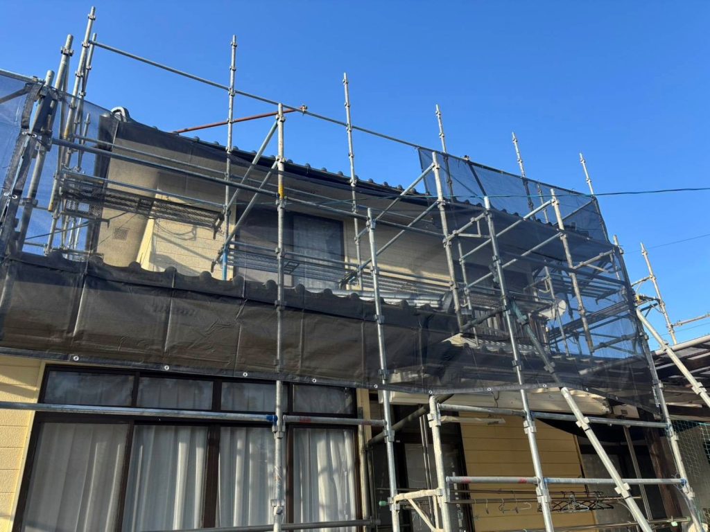 足場組も終わり、今日から大工さん入れて軒天の張替をしていきます。